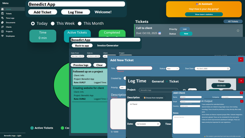 The system includes task and ticket tracking with role-based access, time logging with automated reporting, SharePoint integration for secure data storage, and invoice generation based on time logs. It is designed for small and mid-sized teams (up to 20 users) who want a lightweight yet professional solution without additional SaaS costs.
